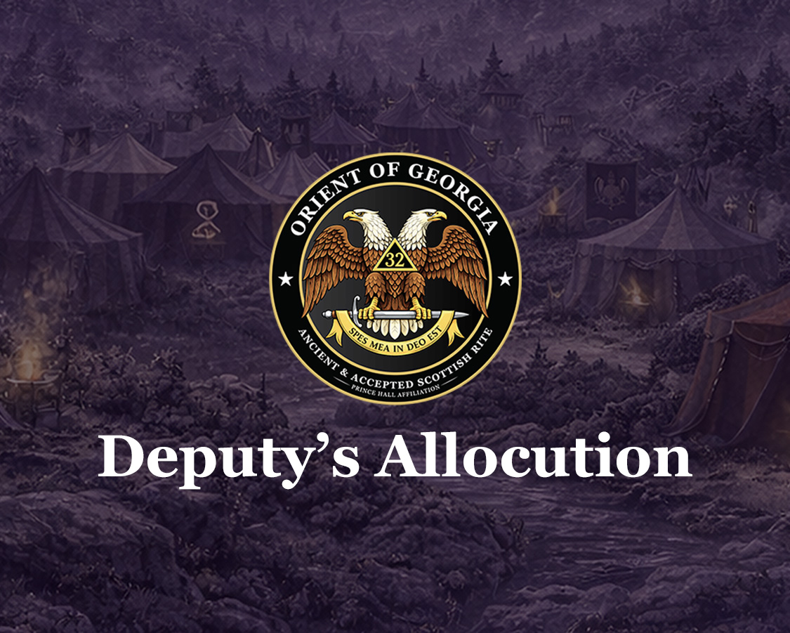 The Orient of Georgia depends not on any one of us, not on some of us, but on all of us. I congratulate you on taking it upon yourself to contribute to your communities. I am proud of all Scottish Rite Masons, and it is an honor to be your Deputy. I say thank you. It is my pleasure as your Deputy to extend greetings to each of you. We are living in a moment that calls for hope, light, and love. Hope is for our futures, light to see our way forward, and love for one another. Through your service, you provide all three. So, as we turn the page from 2025 to 2026, let us step into the future together with unity and purpose, upholding the spirit of scholarship, integrity, and brotherhood that define who we are.